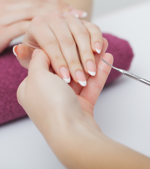 Nach einem Handbad werden die Nägel in Form gefeilt und die Nagelhaut entfernt. Danach folgt als Pflege ein Handpeeling, Nagelöl und eine kleine Handmassage.